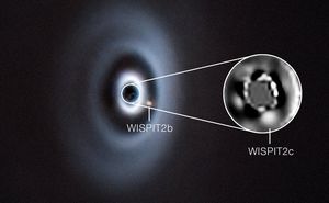 Mit dem Very Large Telescope Interferometer der Europäischen Südsternwarte in Chile gewonnenen Aufnahmen eines internationalen Forschungsteams zeigen gleich zwei große Gasplaneten in ihrer Entstehungsphase. Die Planeten sind etwa fünf- und acht- bis zwölfmal schwerer als Jupiter und umkreisen den 437 Lichtjahre entfernten jungen Stern WISPIT 2 im 60- bzw. 15-fachen Abstand Erde-Sonne.