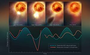 Das Team verglich die von Teleskopen gemessenen Schwingungen von Beteigeuze, sowie seine Temperatur und seine Helligkeit mit theoretischen Modellen der Sternentwicklung. Die beste Übereinstimmung erzielten die Forscher für einen Stern mit der elffachen Masse der Sonne, bei dem der Kohlenstoff bereits fast aufgebraucht ist. „Und wenn der Kohlenstoff im Kern aufgebraucht ist“, so die Forscher, „ist der Kollaps und die davon ausgelöste Supernova-Explosion innerhalb von ein paar Jahrzehnten zu erwarten.“