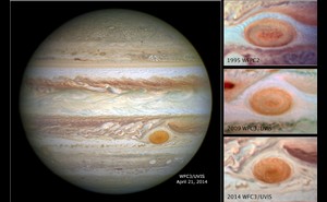 „Unsere Beobachtungen zeigen, dass viele kleinere Wirbel in den großen Sturm eingehen“, berichtet Amy Simon vom Goddard Space Flight Center der Nasa. „Wir vermuten, dass dieser Vorgang für die sich beschleunigende Veränderung des Großen Roten Flecks verantwortlich ist.“ Die kleinen Wirbel könnten, so die Forscherin, die innere Dynamik und die in dem Sturm gespeicherte Energie beeinflussen. Schon bei den ersten Fernrohr-Beobachtungen im 17. Jahrhundert fiel den Himmelsforschern der Große Rote Fleck auf. Messungen im ausgehenden 19. Jahrhundert lieferten noch eine Länge von 41.000 Kilometern. „Jetzt ist er nur noch 16.500 Kilometer groß – so klein wie niemals zuvor“, so Simon.