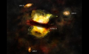 AzTEC-3 ist von mehreren kleineren Systemen umgeben, die ebenfalls Anzeichen für so genannte „Starbursts“ zeigen, also für die explosionsartige Entstehung neuer Sterne. Die Sternentstehungsrate in diesen Zwerggalaxien halte sich aber im Vergleich zu AzTEC-3 im normalen Rahmen für diese kosmische Epoche, so Riechers. „Diese Gruppierung von Galaxien repräsentiert einen wichtigen Meilenstein der kosmischen Entwicklung“, so der Forscher. „Wir sehen hier die Bildung eines Galaxienhaufens und die erste Phase der Entstehung einer großen, reifen Galaxie.“