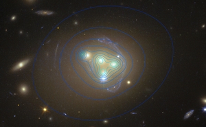 Die Beobachtungen von Massey und seinen Kollegen mit dem Very Large Telescope der Europäischen Südsternwarte ESO, sowie dem Hubble Space Telescope, zeigen nun erstmals, dass eine solche zusätzliche, wenn auch extrem schwache Selbst-Wechselwirkung trotzdem vorhanden sein muss. Die Forscher haben die Bewegung von vier Galaxien im Zentrum des Galaxienhaufens Abell 3827 untersucht. Die Astronomen profitierten zusätzlich von einem Zufall: In größerer Entfernung hinter dem Galaxien-Quartett liegt ein weiteres Sternsystem. Die Schwerkraft des Quartetts lenkt als Gravitationslinse das Licht dieser Galaxie ab und verzerrt so ihr Bild. Aus dieser Verzerrung konnten Massey und seine Kollegen die Verteilung der Dunklen Materie in den vier Galaxien ermitteln.