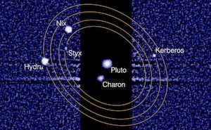 “Die vier kleinen Monde – Styx, Nix, Kerberos und Hydra – umkreisen den Zwergplaneten Pluto und seinen großen Mond Charon auf nahezu kreisförmigen, in einer Ebene liegenden Bahnen“, erläutern Mark Showalter vom SETI Institute in Kalifornien und Douglas Hamilton von der University of Maryland. Überraschend für die Astronomen beträgt die synodische Periode von Styx und Nix – also die Zeitdauer, nach der sich die beiden Trabanten an der gleichen Stelle ihrer Bahnen wieder begegnen – gerade das Anderthalbfache der synodischen Periode von Nix und Hydra. Wie diese Dreier-Resonanz entstanden ist, sei völlig unklar, so die beiden Forscher.
