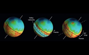 „Die Tharsis-Region ist der größte vulkanische Komplex nicht nur auf dem Mars, sondern im gesamten Sonnensystem“, schreiben Sylvain Bouley von der Universität Paris und seine Kollegen. Die gewaltige Masse der Schildvulkane führte zu einer Neuorientierung der Rotationsachse des Planeten, deshalb befindet sich die Tharsis-Region heute am Äquator. Bislang gingen die Planetenforscher aufgrund der Orientierung der ausgetrockneten Flusstäler davon aus, dass sich diese Strukturen erst nach der Entstehung der Tharsis-Vulkane durch veränderte klimatische Bedingungen und damit einhergehende Niederschläge gebildet hatten.