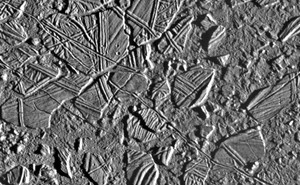Europa ist mit einem Durchmesser von 3121 Kilometern der kleinste der vier großen galiläischen Jupitermonde. Seine Oberfläche ist von einer 80 bis 170 Kilometer dicken Kruste aus Wassereis bedeckt, darunter befindet sich vermutlich ein etwa 100 Kilometer tiefer Ozean. Das Wasser bleibt trotz der großen Entfernung des Jupiter-Systems von der Sonne flüssig, weil der Mond von den Gezeitenkräften des großen Planeten förmlich durchgewalkt und ihm damit Energie zugeführt wird.